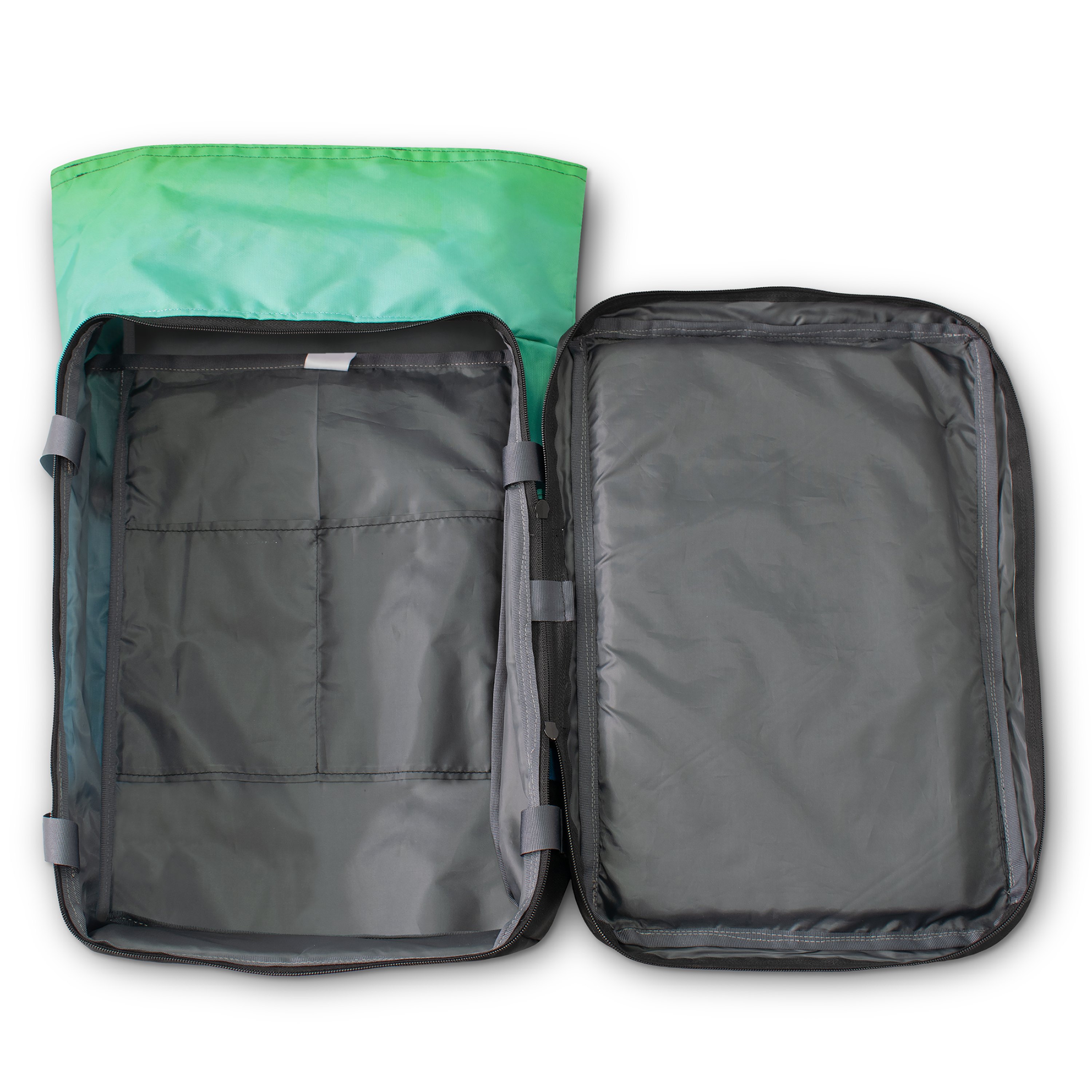 Morral expandible con cierre enrollable de hasta 25L, impermeable y apto como equipaje de mano. Incluye acceso posterior, bolsillos internos, compartimento para portátil de 13” y diseño ergonómico acolchado, ideal para viajes y uso diario.